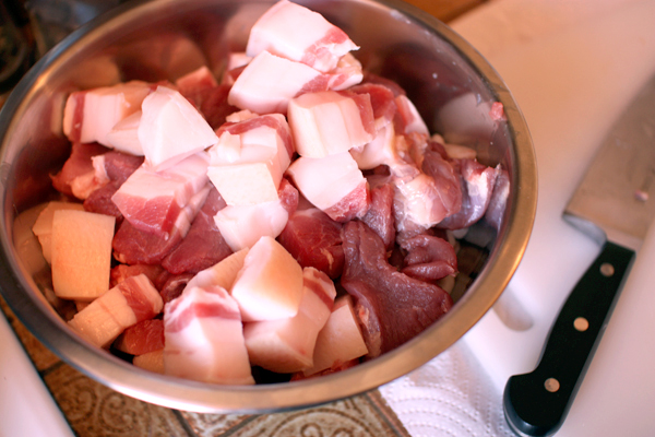Your goal in grinding is to evenly integrate the fat (salt pork) with the leaner shoulder. Start by cubing all of the meat so that the cubes will fit into the grinder and mix them together: