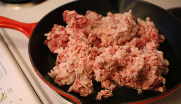 After the casings are soaking, cook the ground meat along with the onions. I followed the advice to cook the meat in a pan until the fat was rendered and a smaller amount of steam was coming off, then added onion: