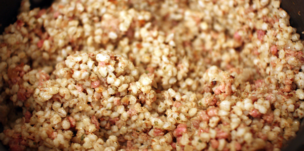 After about 30 minutes total, the meat should be cooked and the onion soft. Move the cooled barley to a pot and dump all of the sauteed meat and onions on top (make sure to include the rendered fat!). Add the spices and mix to integrate evenly.