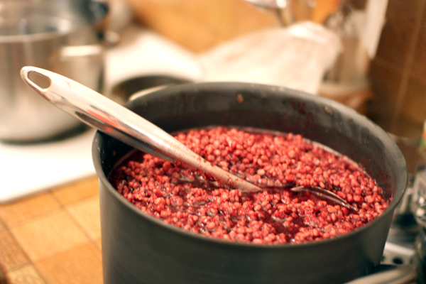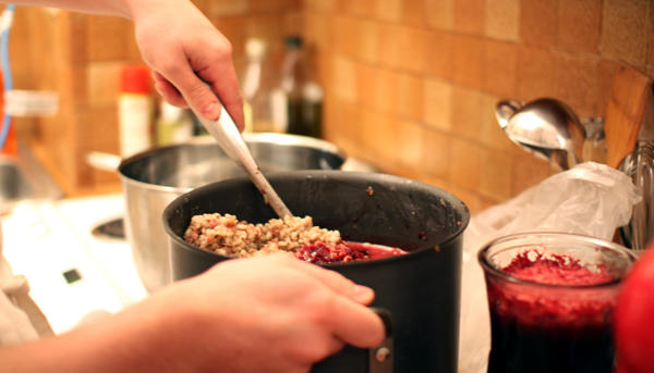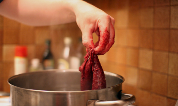 Make sure that the whole mixture is fairly cool (you don’t want to cook the blood with any residual heat) and mix in the pig’s blood. You’ll notice that the blood is sitting in a glass vase in the picture—the whole gallon took a long time to thaw, so I wound up pouring it out and mixing it with a spoon to break up ice chunks. The vase was the only free container in my kitchen large enough at this point.