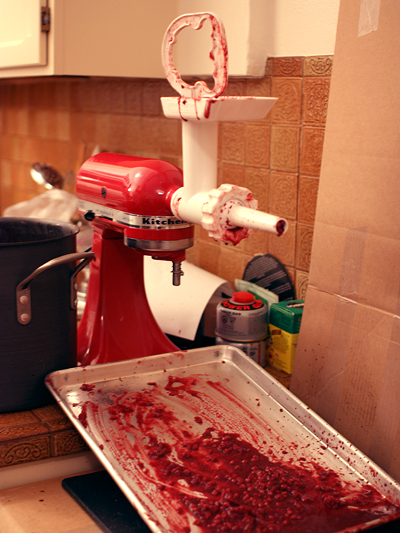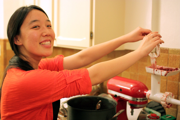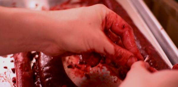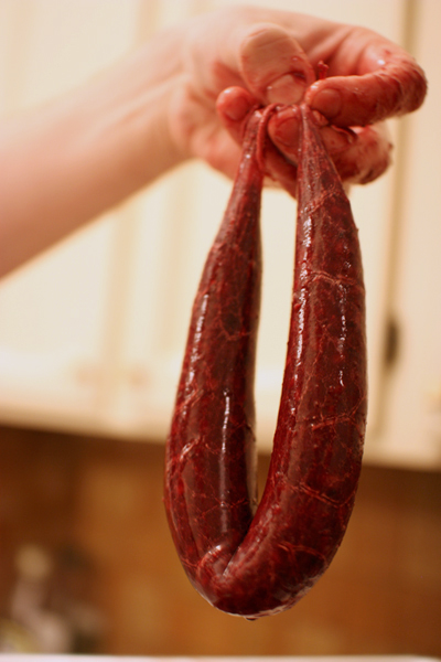 You’ll notice a tray below the stuffer and a piece of cardboard against the wall. I was smart enough to get the tray in place before we began, but there was a moment where one of the sausages broke and started spraying sheets of blood against the wall of our kitchen. After cleaning up we got the cardboard in place which helped the next time that happened. Something to think about when setting up your workspace, I guess.