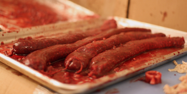 It’s very important not to stuff the sausages too much or else they will burst while cooking. In the following picture you’ll see how they flatten out a bit and look a bit deflated. That’s what you should shoot for. We made maybe 5 or 6 at a time and let them sit like this for a few minutes before boiling them. This allowed the blood to even out throughout the sausage, which led to a more consistent product.