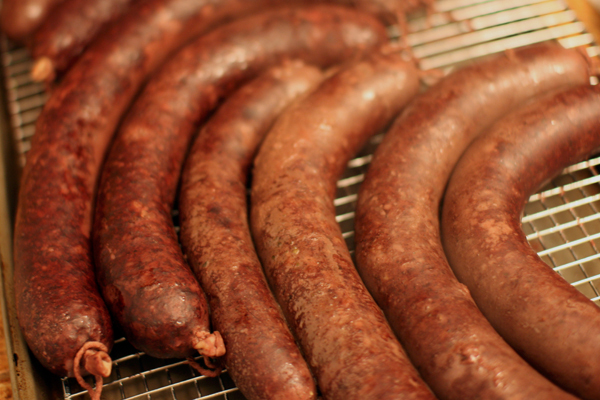 I’ll also point out that stuffing is really a two person job. One person feeds the stuffer by spooning mixture into the top, while the other guides it into the casings and tries to make sure that the mixture is evenly distributed. It’s really important that the stuffer keep stirring the mixture to keep it even. The person handling the casings must not overstuff the sausages and also needs to pay attention to consistency. Because the Kitchenaid wasn’t stuffing evenly, we’d get a trickle of blood for a while then a huge glob of barley all at once. Some light massaging of the sausage was required to even things out.