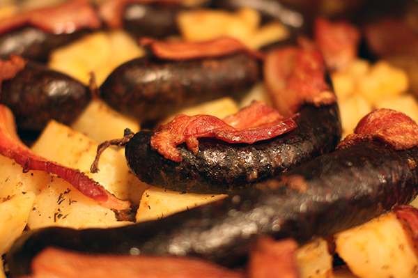 If you’ve never tried blood sausage, you may be imagining a kind of gross congealed sausage, possibly with a coppery or metallic taste. In truth, the consistency is much more crumbly and soft. The taste is more like an earthy meatloaf—much more identifiable as marjoram and barley than as blood.