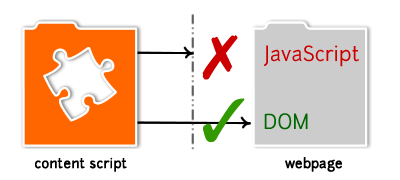 But that’s not completely right- there’s one more level of isolation in effect, which is that a content script can’t access everything in the web page it is currently running on. While the content script can read and write the DOM nodes on the page without any issue, it can’t access native JavaScript code in the page: