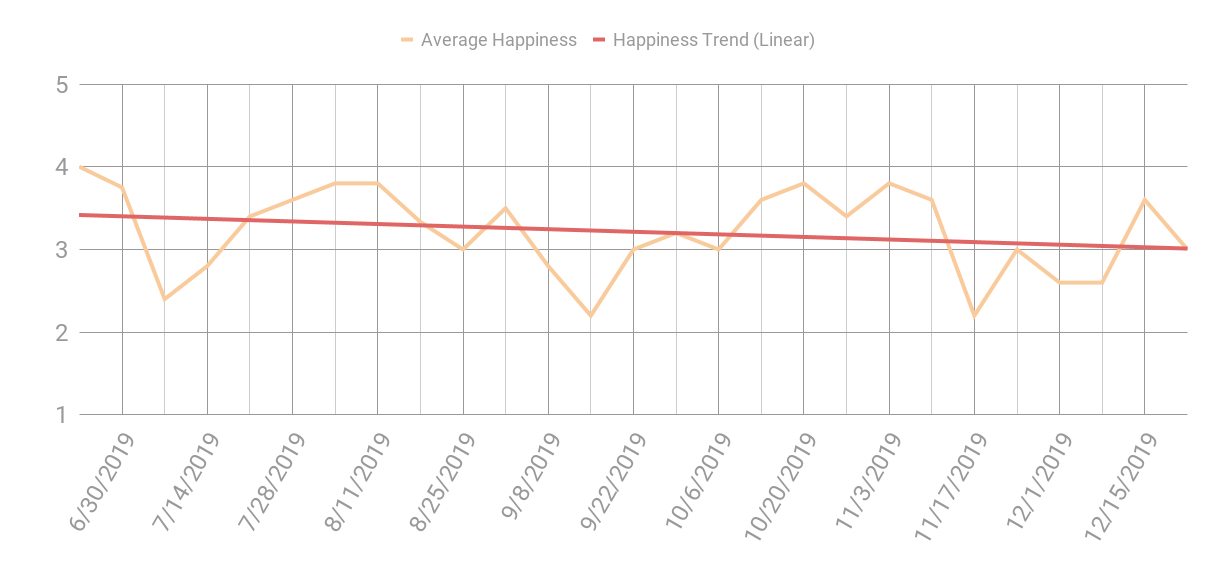 In June I was feeling overwhelmed at work and wanted to try and understand that better. I started scoring myself on a subjective 5 point scale on how happy I was feeling at the end of each day: 1 being a really bad day, 3 fairly unremarkable, and 5 fantastic. I averaged each measure by week and plotted the trendline below. I think the line indicates what I’ve intuitively suspected–that I was slowly getting more unhappy in 2019. The graph includes working days only and doesn’t count in weekends (where I’m generally happier), but I think the measure is still pretty interesting. I’ll be tracking this every day in 2020.