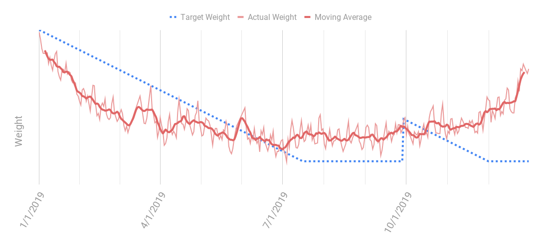 My goal was to get into better shape in 2019, so I modeled a target weight which decreated each day until reaching my goal for the year. Then I counted how many days I could stay below target. In the first half of the year, I kept on pace or better and even reached my annual goal for a single day in July. Something switched at that point and I started steadily gaining pounds back. I tried to reset my daily target in September when I had gotten really far away from it, but that didn’t work. I really lost control of things in the period from Thanksgiving through New Years as you can see from the graph below. A minor setback I hope: I’m starting this year better off than I was at the start of 2019 and I continue trying to figure out what works for me in 2020.
